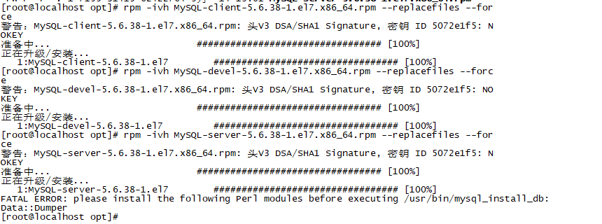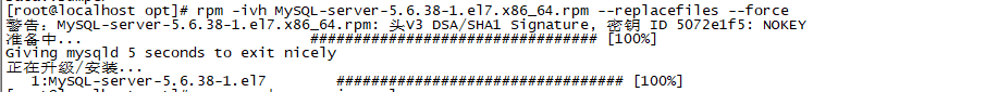 rpm -ivh MySQL-server-5.6.38-1.el7.x86_64.rpm --replacefiles --force