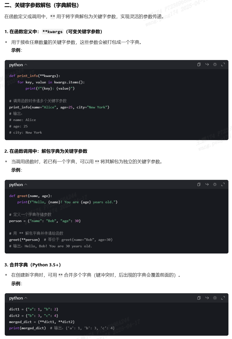 要理解 func(*args, **kwargs) 的传参逻辑,核心是区分 函数定义时 和 函数调用时 这两个场景 —— 两者都用到了 * 和 **,但作用完全相反:定义时是「打包参数」,调用时是「解包参数」。示例: