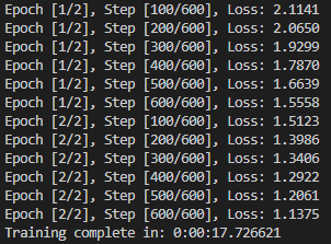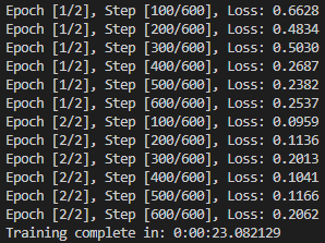 print('Epoch [{}/{}], Step [{}/{}], Loss: {:.4f}'.format(epoch + 1, epochs, i + 1, total_step, loss.item()))