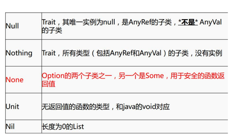 | AnyRef | AnyRef类是Scala里所有引用类(reference class)的基类 |
