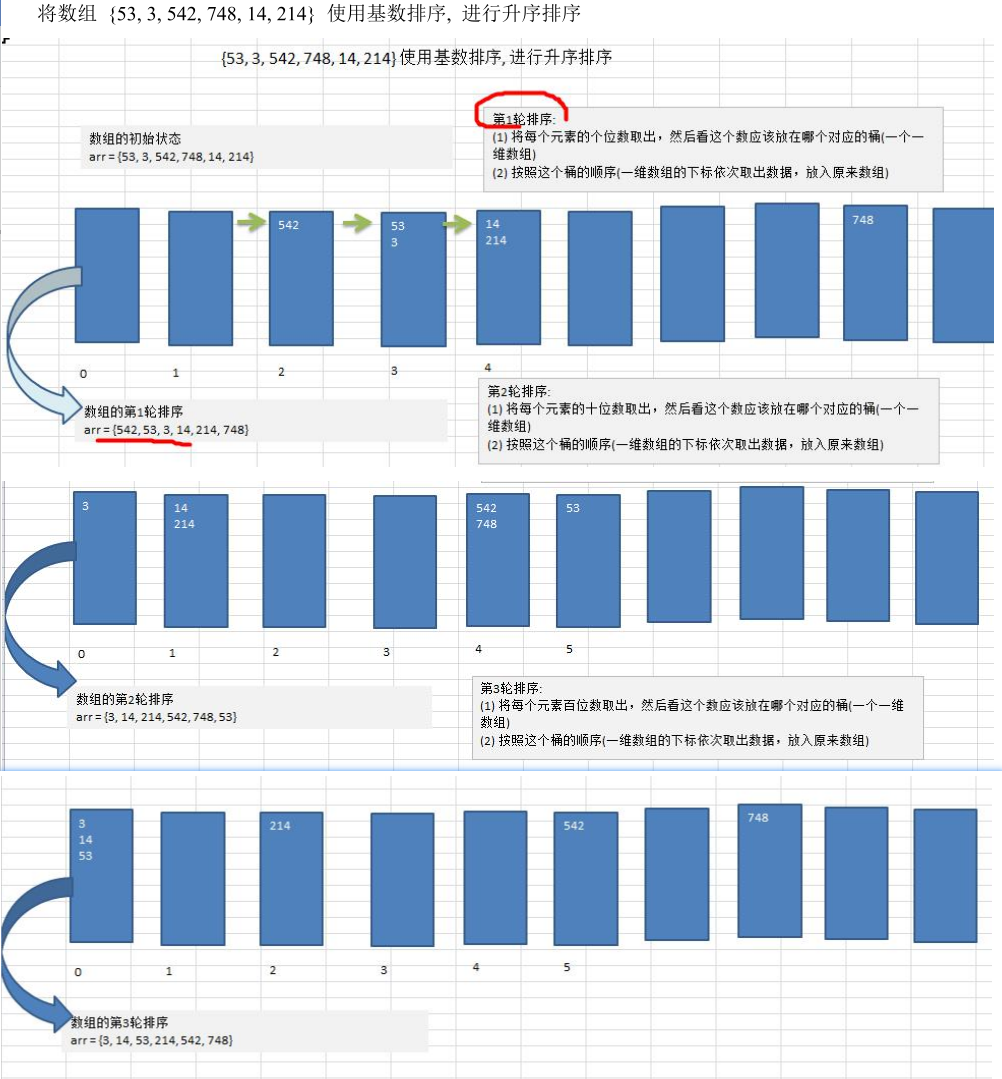 2) 这样说明,比较难理解,下面我们看一个图文解释,理解基数排序的步骤