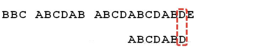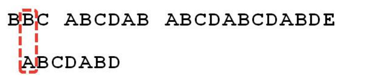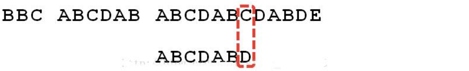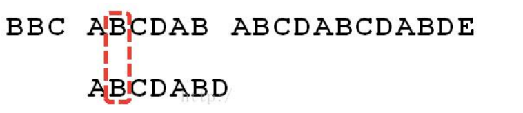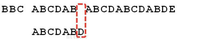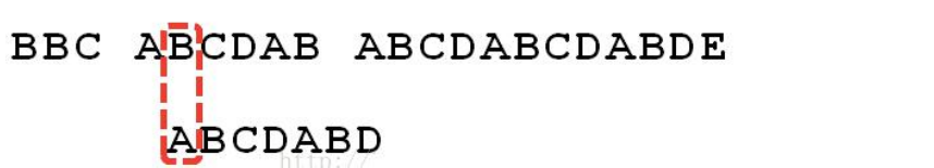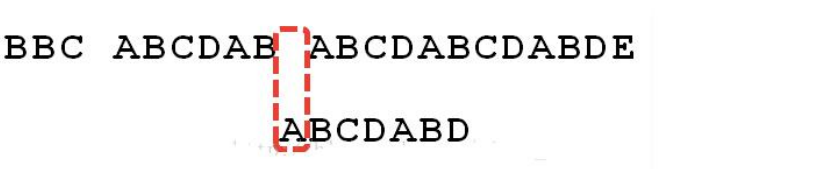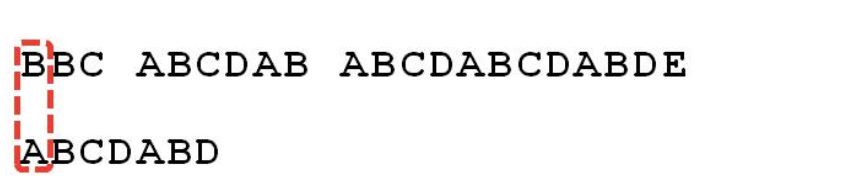 6.这时候,想到的是继续遍历 Str1 的下一个字符,重复第 1 步。(其实是很不明智的,因为此时 BCD 已经比较过了,没有必要再做重复的工作,一个基本事实是,当空格与 D 不匹配时,你其实知道前面六个字符是”ABCDAB”。