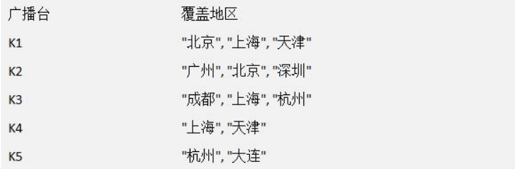 1) 假设存在如下表的需要付费的广播台,以及广播台信号可以覆盖的地区。 如何选择最少的广播台,让所有的地区都可以接收到信号