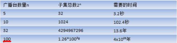 如何找出覆盖所有地区的广播台的集合呢,使用穷举法实现,列出每个可能的广播台的集合,这被称为幂集。假设总的有 n 个广播台,则广播台的组合总共有2ⁿ -1 个,假设每秒可以计算 10 个子集