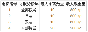题目二:现有一新建办公大厦,共有21层,共有四部电梯,所有电梯基本参数如下表所示,其使用规定如下: