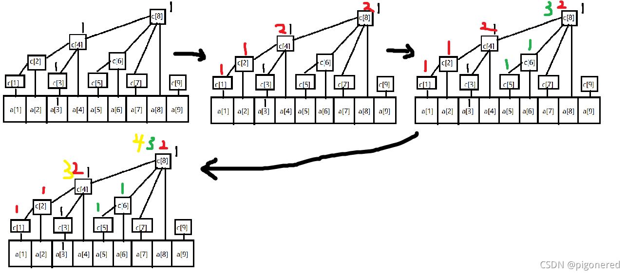 还是上面的图,我们发现c[1,3,5,7,9]高度看做0,而a[2,6]为1,a[4]为2,a[8]为3。正好就去连了多少个除它以外的直接的儿子个数。