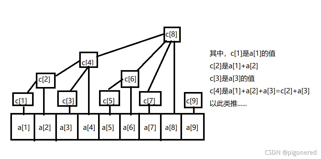 我们已知c[4]是存的a[1]+a[2]+a[3]的和,那么前缀和已经求出了,我们在看看sum[7],c[7]只存储了a[7],c[6]储存了a[5],a[6],c[4]储存了a[1~4],所以sum[7]=c[7]+c[6]+c[4],也就是它的左边兄弟的和。