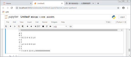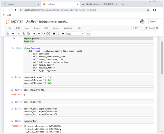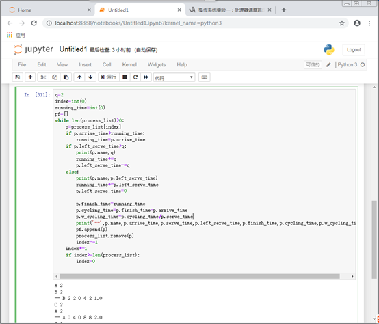 import psutil import os class Process: def __init__(self,name,arrive_time,serve_time): self.name=name self.arrive_time=arrive_time self.serve_time=serve_time self.left_serve_time=serve_time self.finish_time=0 self.cycling_time=0 self.w_cycling_time=0 processA=Process('A',0,4) processC=Process('C',2,2) processB=Process('B',4,6) processB.serve_time process_list=[] process_list.append(processA) process_list.append(processB) process_list.append(processC) process_list for p in process_list: print(p.name,p.arrive_time,p.serve_time) process_list.sort(key=lambda x:x.arrive_time) for p in process_list: print (p.name,p.arrive_time,p.serve_time,p.left_serve_time,p.finish_time,p.cycling_time,p.w_cycling_time) q=2 index=int(0) running_time=int(0) pf=[] while len(process_list)>0: p=process_list[index] if p.arrive_time>running_time: running_time=p.arrive_time if p.left_serve_time>q: print(p.name,q) running_time+=q p.left_serve_time-=q else: print(p.name,p.left_serve_time) running_time+=p.left_serve_time p.left_serve_time=0 p.finish_time=running_time p.cycling_time=p.finish_time-p.arrive_time p.w_cycling_time= p.cycling_time/p.serve_time print (p.name,p.arrive_time,p.serve_time,p.left_serve_time,p.finish_time,p.cycling_time,p.w_cycling_time) pf.append(p) process_list.remove(p) index-=1 index+=1 if index>=len(process_list): index=0