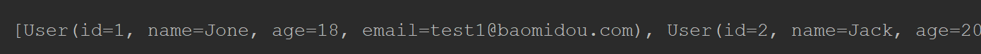 @Autowired private UserMapper userMapper; @Test void findAll() { List<User> users = userMapper.selectList(null); System.out.println(users); }