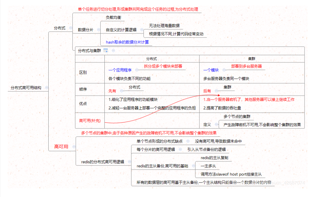 分布式处理里必然包含任务分解与答案归并。分布式中的某个子任务节点,可能由一个集群来代替;集群中任一节点,都是做一个完整的任务。