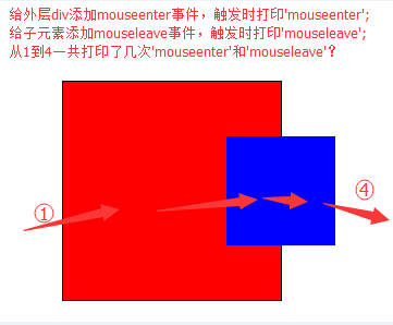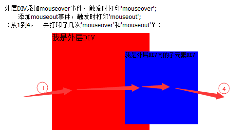 步骤1进入外层DIV触发了一次mouseover。步骤2中从外层DIV元素上移开触发了mouseout,当进入子元素DIV时会触发子元素的mouseover,由于会冒泡,所以也触发了外层DIV的mouseover事件。步骤3(只有子元素DIV触发相应的事件时,才会由冒泡的原因触发父级元素的相同事件,所以即使在图上可以看到鼠标已经不在外层DIV的范围内了,仍然不会触发mouseout事件)。步骤4原因同步骤3相同,此时子元素DIV触发了mouseout事件,同样会冒泡到父级DIV上。