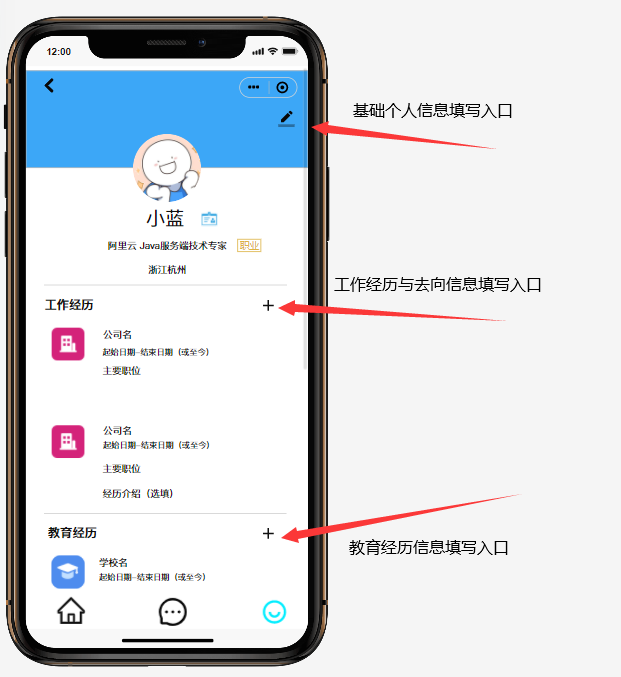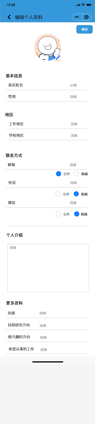 登录成功后在我的界面进行个人信息的补充与填写。个人信息分为三个模块填写。