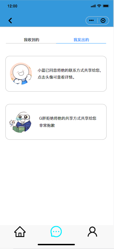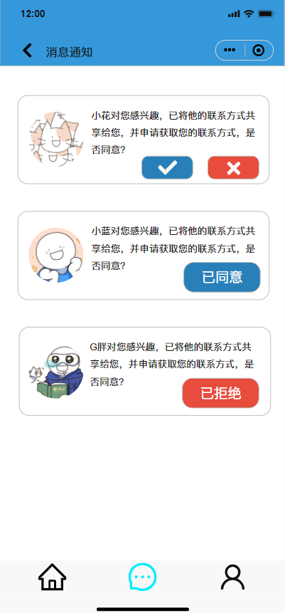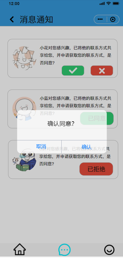 联系他按钮发送的联系方式请求的信息在这里进行同意与拒绝 -
