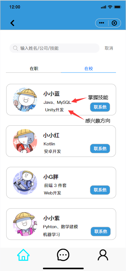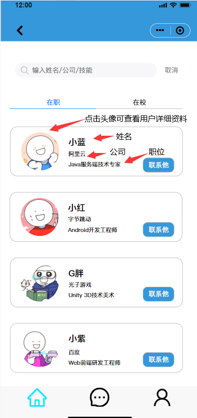 联系他按钮向对于用户发起获取联系方式的申请。 - 在用户列表上提供搜索栏,可根据关键词进行对应用户信息的查询