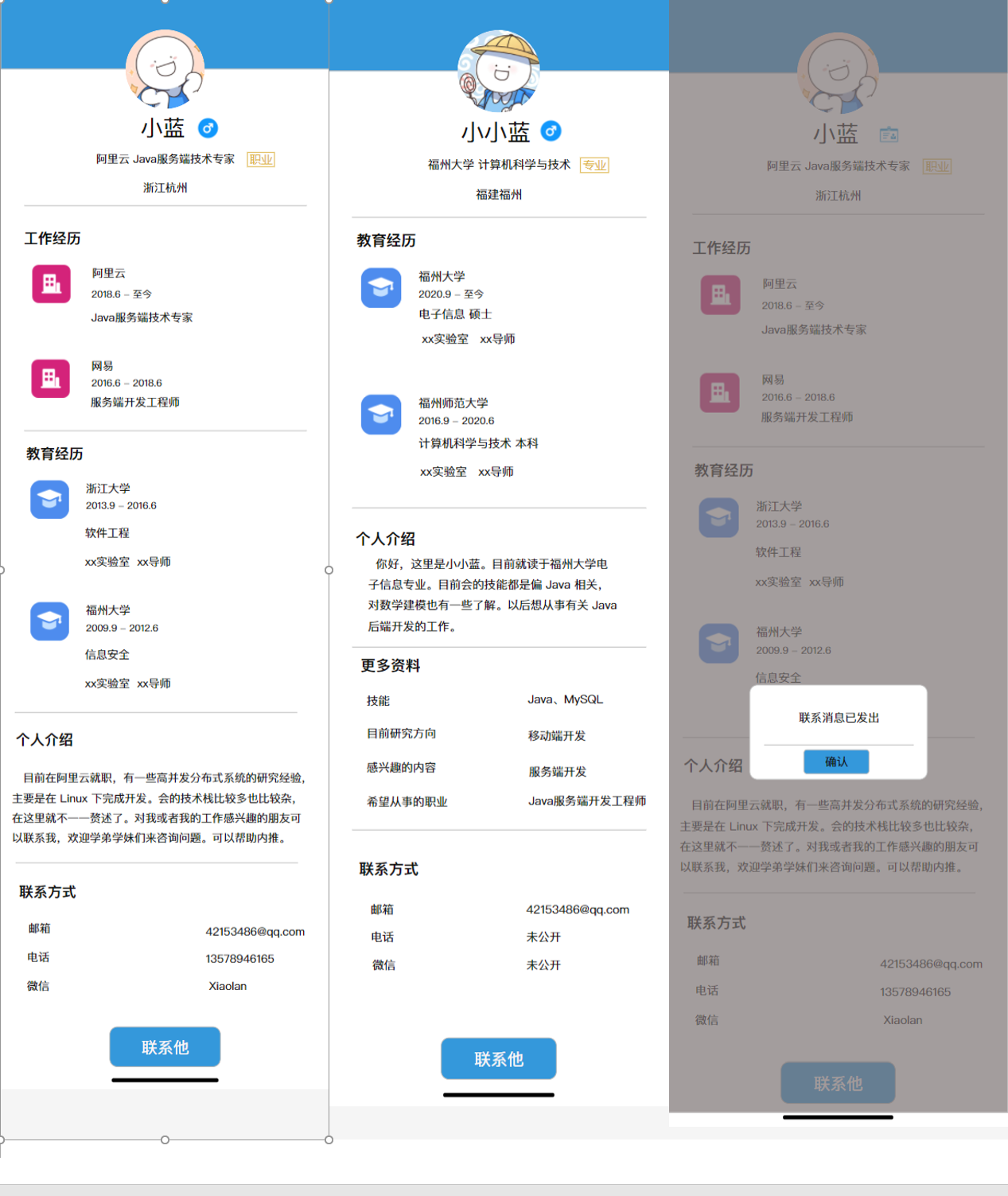 个人资料填写过程中如果电话与微信展示权限为公开的,在联系他按钮点下后,便立即发送联系方式给申请的用户