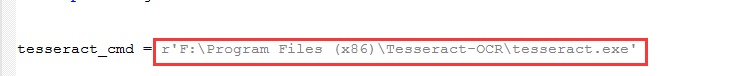3)修改python安装路径中的pytesseract.py文件,将tesseract_cmd改为r'F:\Program Files (x86)\Tesseract-OCR\tesseract.exe'