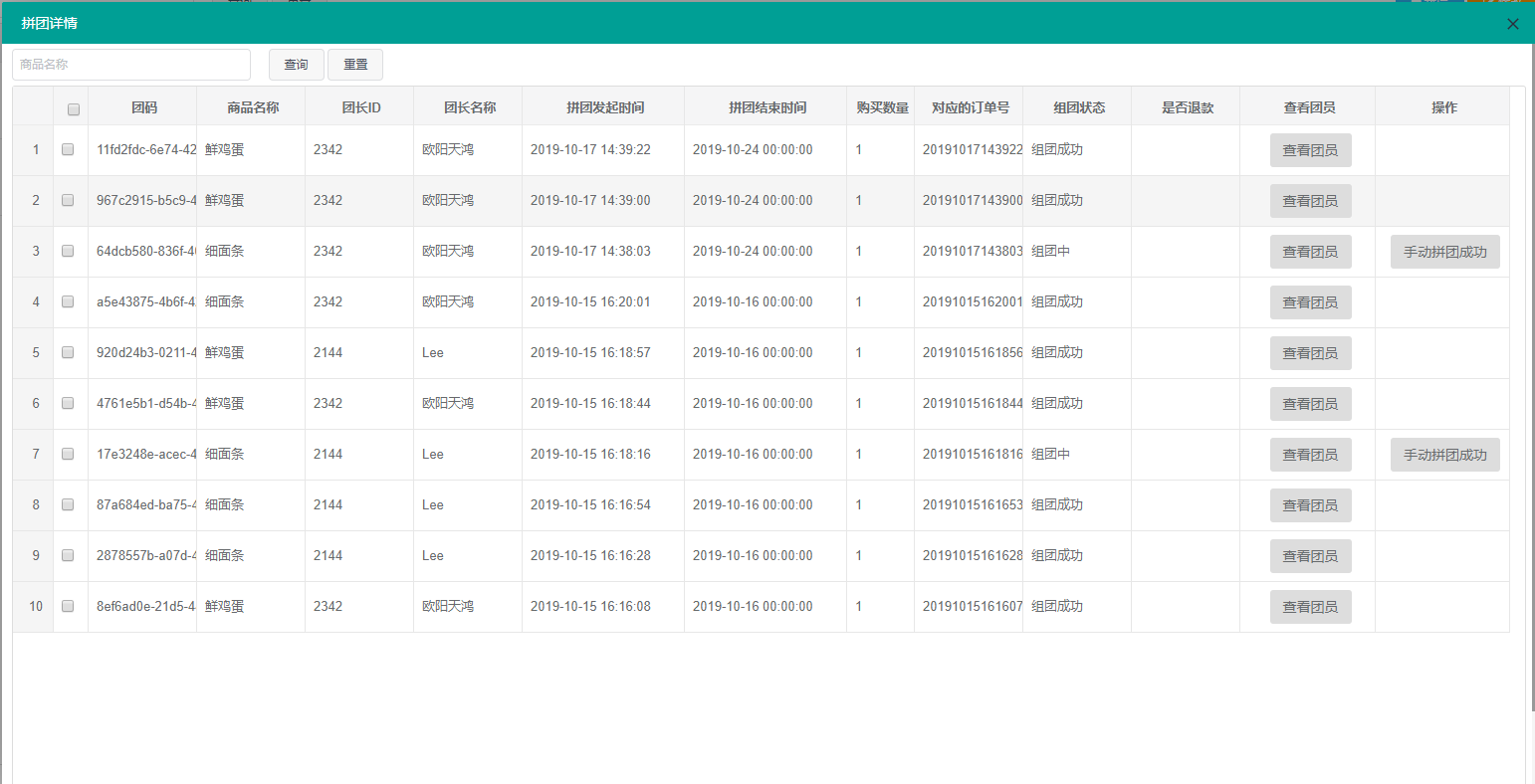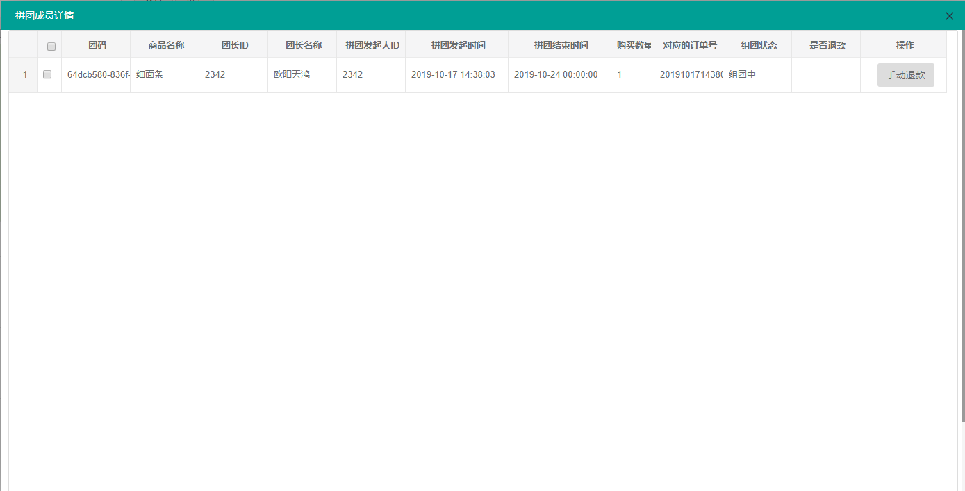 根据业务需求,我们在这里添加了“手动成团”的按钮,在用户参团付款但尚未构成成团条件后,我们的运营可以根据业务需求手动拼团成功