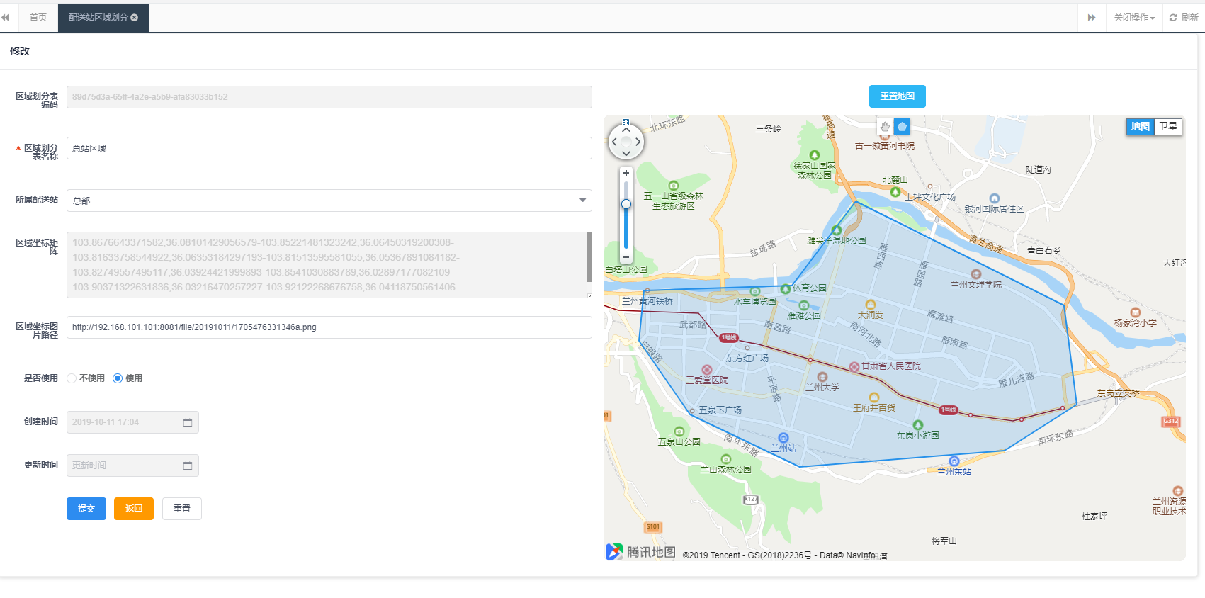 根据腾讯地图划分配送区域,总站下边设多个配送分站,然后将订单中的收货地址将其分配给不同的配送分站。
