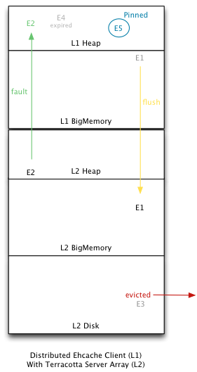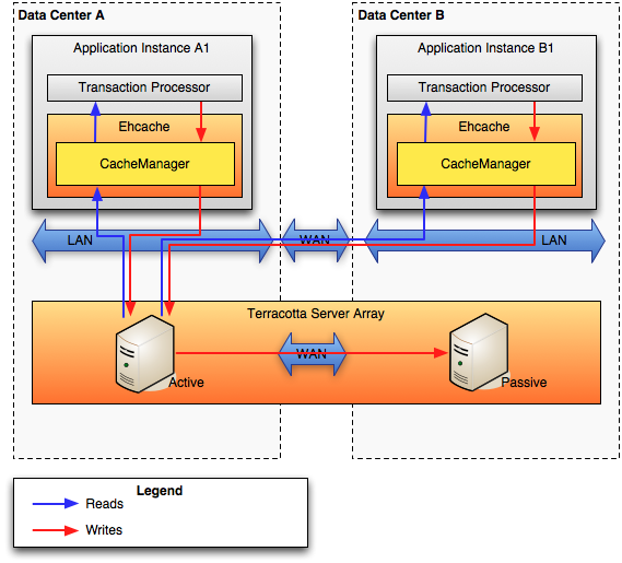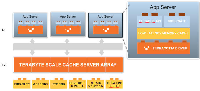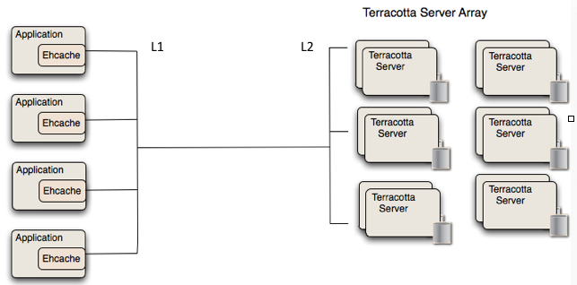 2、分布式缓存(Distributed Ehcache):数据存储在Terracotta的服务器阵列(Terracotta Server Array,TSA)中,但是最近使用的数据,可以存储在各个应用节点中。