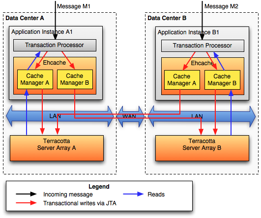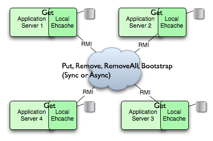 - 使用RMI、JGroups或者JMS来冗余缓存数据:节点可以通过多播或发现者手动配置。状态更新可以通过RMI连接来异步或者同步完成。