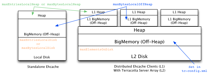 - 缓存在内存和磁盘存储可以伸缩到数G,Ehcache为大数据存储做过优化。