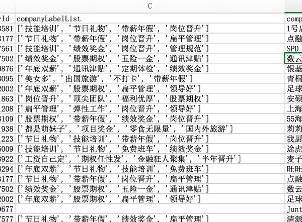 companyLabelList是公司标签,诸如技能培训啊、五险一金啊等等。直接用分列即可。大家需要注意,分列会覆盖掉右列单元格,所以记得复制到最后一列再分。