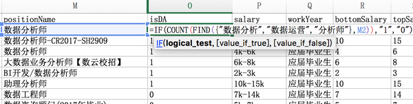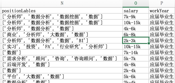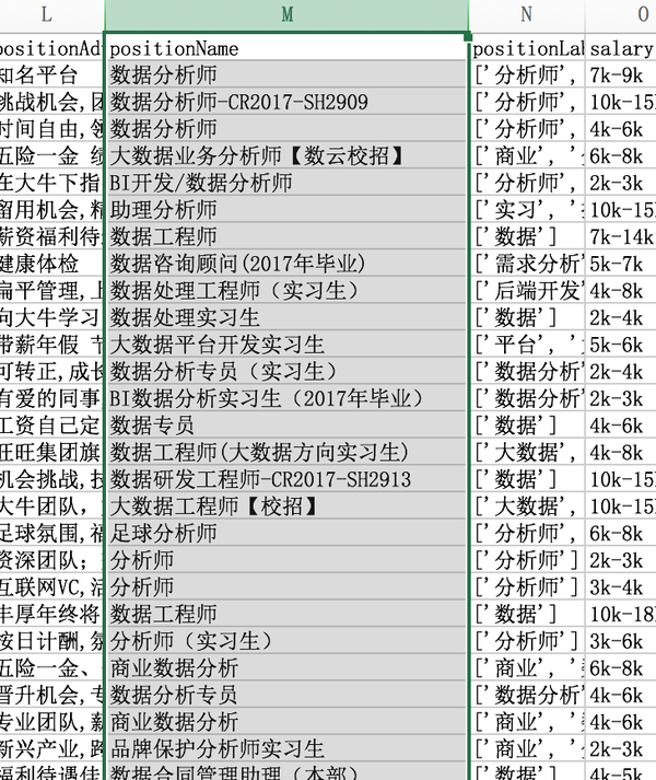 接下来是positionName,上文已经讲过有各种乱七八糟或非数据分析师职位,所以我们需要排除掉明显不是数据分析师的岗位。