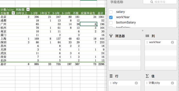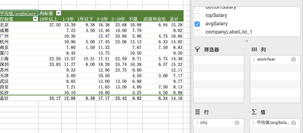 我们的分析也属于多维度,城市、工作年限、企业大小、企业领域等,利用不同维度形成一个直观的二位表格,而维度则是通过早期的数据清洗统一化标准化。这是一种很常见的分析技巧。