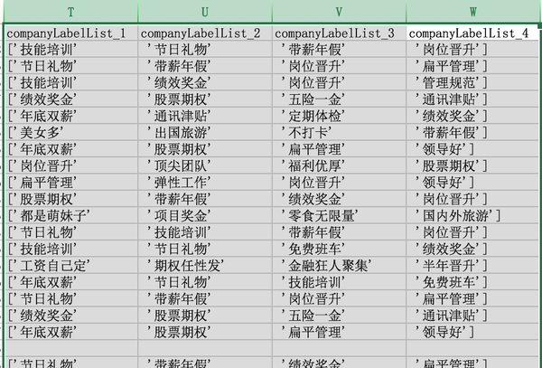 看来福利倒是不错,哈哈,不过这会影响我们的分析。businessZones、positionAdvantage和positionLables也是同样问题,我们后续得将这类格式拆分开来。