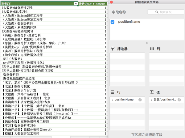 单独针对positionName用数据透视表。统计各名称出现的次数。