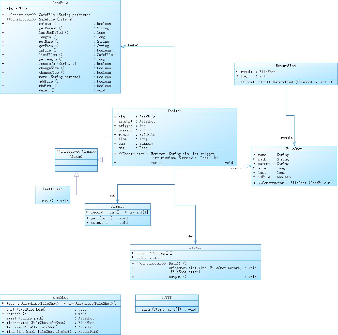为了避免以上的难以预测的问题,这次的程序引入了快照的方式,即每次获取、对比的方法对监控对象操作时都对监控对象进行一次快照,把需要的属性、特点等以快照的形式获取,同时也完成了记录的功能,用快照完成判断,这样线程安全的问题在这一部分就得到了解决。另外对监控对象属性的改变都使用了同步方法,保证程序不会运行出预期之外的结果(SafeFile的作用)。