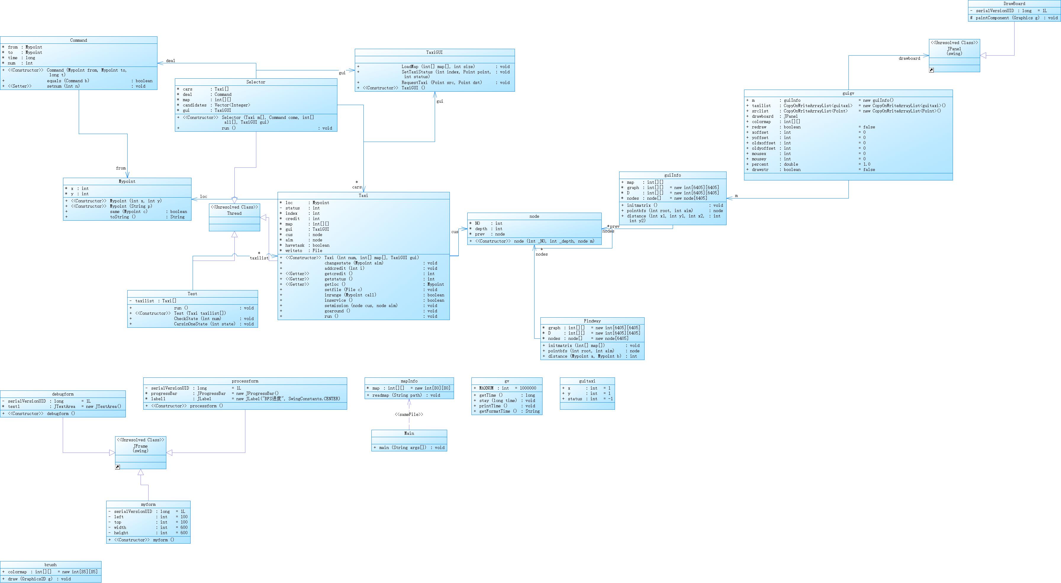 程序将出租车本体与出租车的运动、完成任务都装载在出租车类中,三秒中的窗口是一个依照呼叫请求创建出来的线程,获取出租车的状态完成派单的工作。主要的工作都由这两个类来完成大的调度,其他类实现自己管辖的功能,共同完成运行。