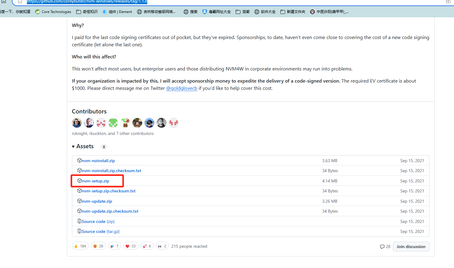 下载地址:Tags · coreybutler/nvm-windows · GitHub