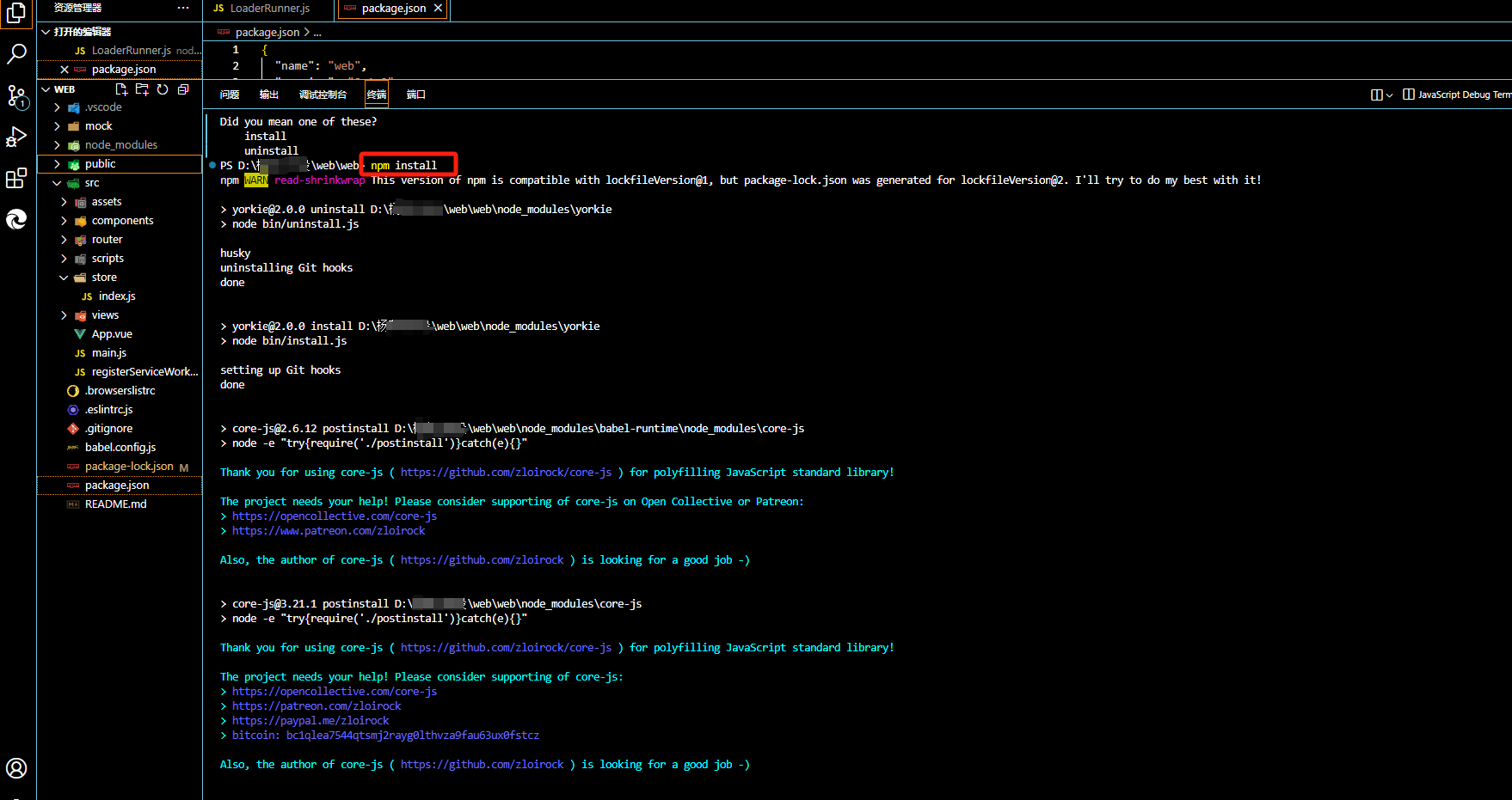 打开visual,导入项目,然后在控制套输入npm install,中途没有报错说明安装成功
