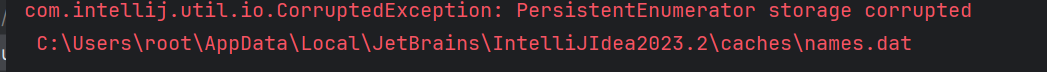 com.intellij.util.io.CorruptedException: PersistentEnumerator storage corrupted C:\Users\root\AppData\Local\JetBrains\IntelliJIdea2023.2\caches\names.dat