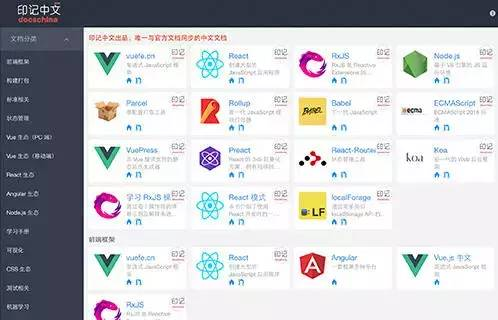 docschina 印记中文网收集了由社区翻译的比较流行的前端相关框架、工具的中文版文档。为学习一些新的框架扫平了语言障碍。