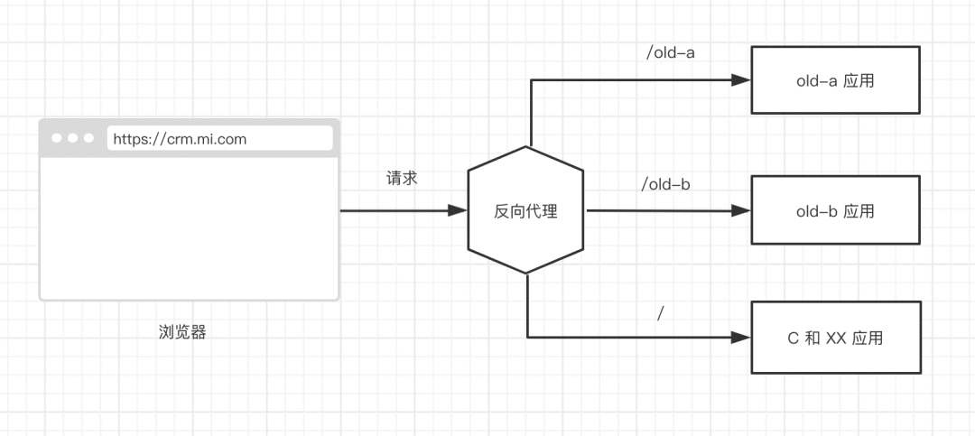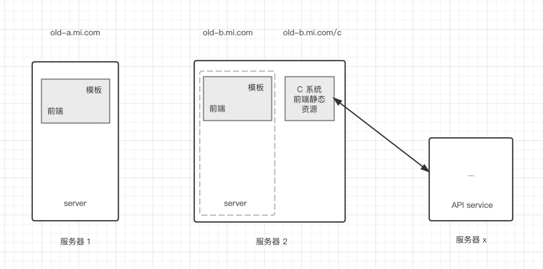 此时,两个老系统分别部署在各自的服务器,C 和未来的多个应用部署在同一台服务器。然后,在 Nginx 层 为老系统分配了两个路由(暂且称之为 old-a 和old-b),分别将请求打到各自的服务器,根路由打到 C 和 xx 应用的服务器。