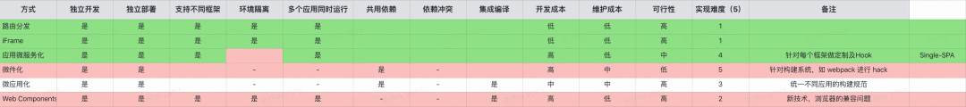 总体的改造方案使用微前端的思想进行。对上面提到的六种方式进行对比(点击查看大图):