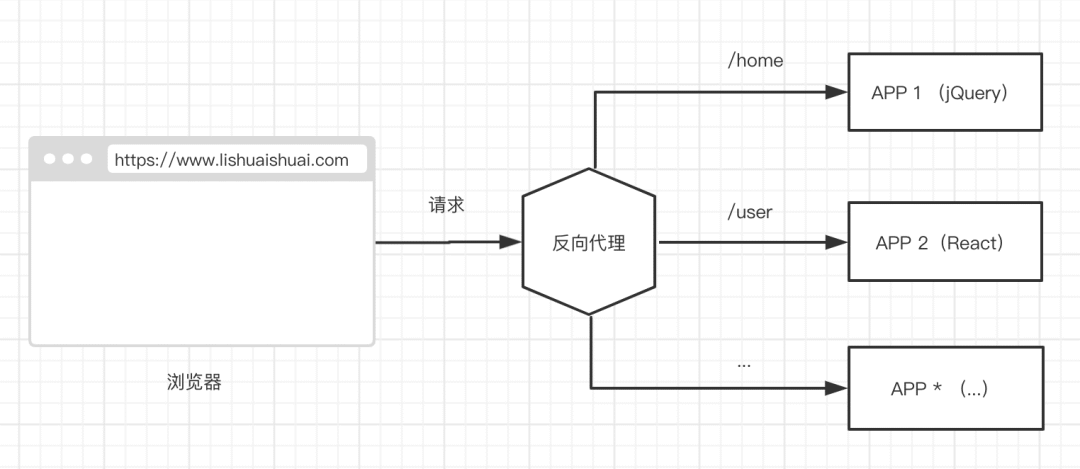 路由分发式微前端,即通过路由将不同的业务分发到不同的、独立前端应用上。其通常可以通过 HTTP 服务器的反向代理来实现,又或者是应用框架自带的路由来解决。如图: