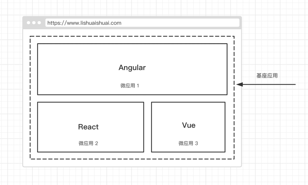 采用这种方式意味着,一个页面上可以同时存在两个以上的前端应用在运行。如图: