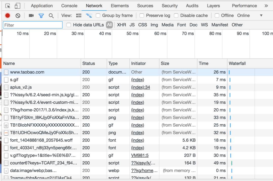 被Service Worker缓存的文件,可以在Network中看到Size项为 from ServiceWorker: