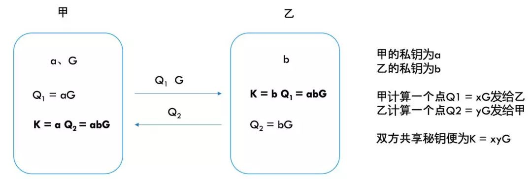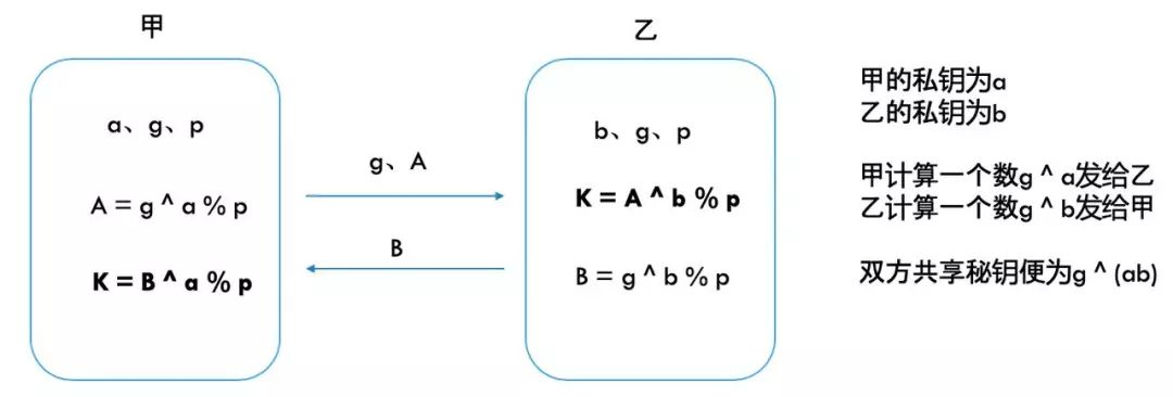 为了得到共享秘钥 K,甲用它的私钥计算一个数 g^a,发送给乙,乙的私钥为 b,乙便得到 K= g^a^b,同时发送 g^b 给甲,甲也得到了 K=g^b^a。
