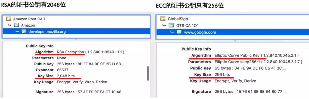 现在的证书的签名算法有两种:RSA 和新起的 EC。如下图所示,google.com 便是使用的 ECC 证书: