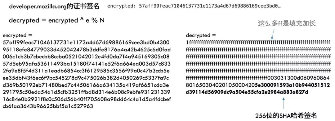 取解密后的数字 decrypted 的十六进制的末 64 位,即为二进制 256 位的 SHA 哈希签名。