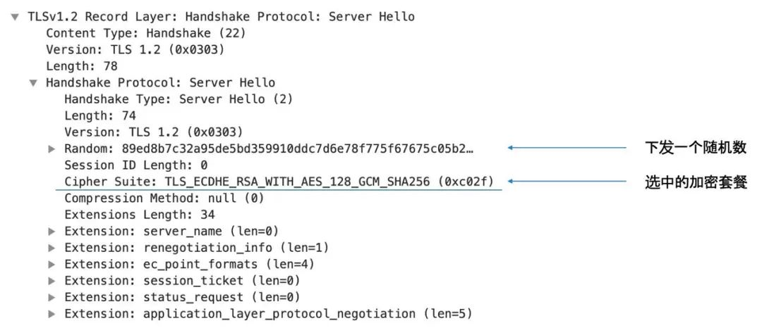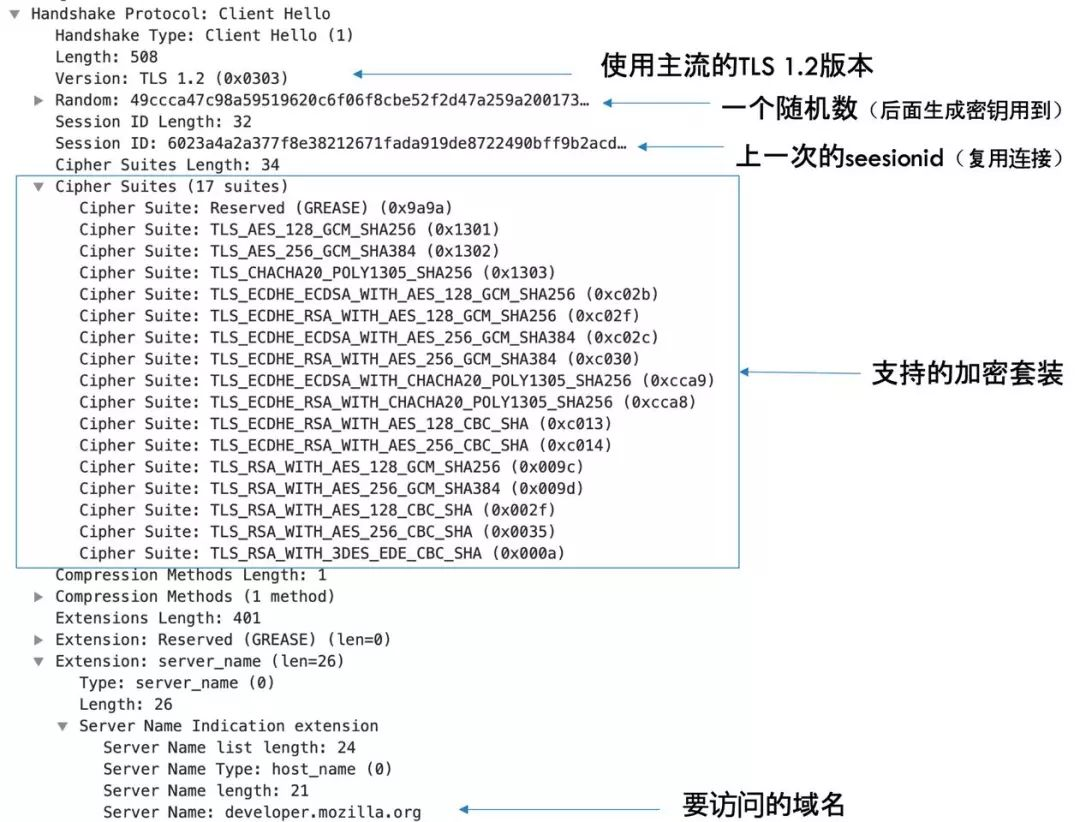 包括客户端要使用的 TLS 版本,支持的加密套装,要访问的域名,给服务端生成的一个随机数(Nonce)等。
