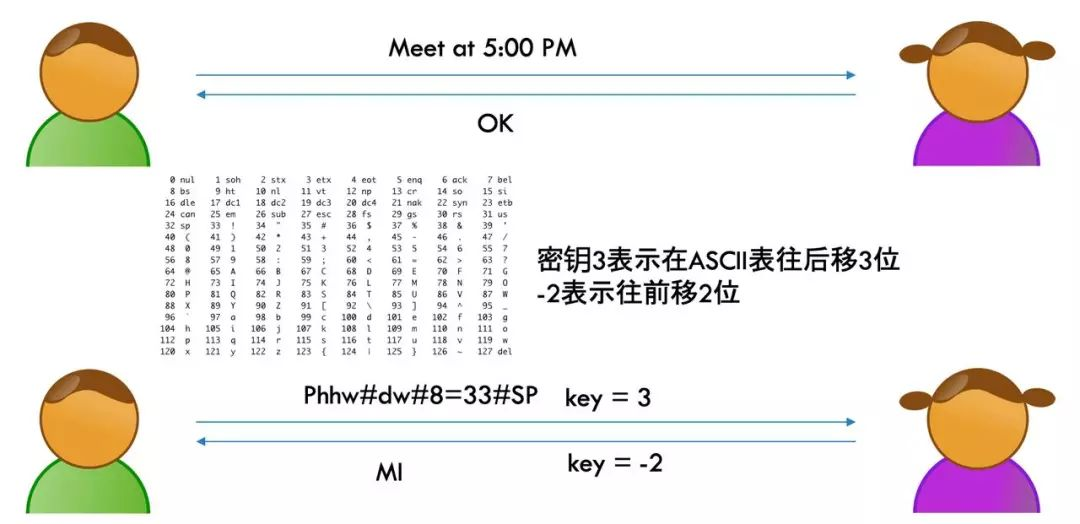 他想发送的数据是"Meet at 5:00 PM"(5 点见面,如果是中文的话可以使用 UTF-8 编码),加密方式是直接在 ASCII 表进行左移或右移。