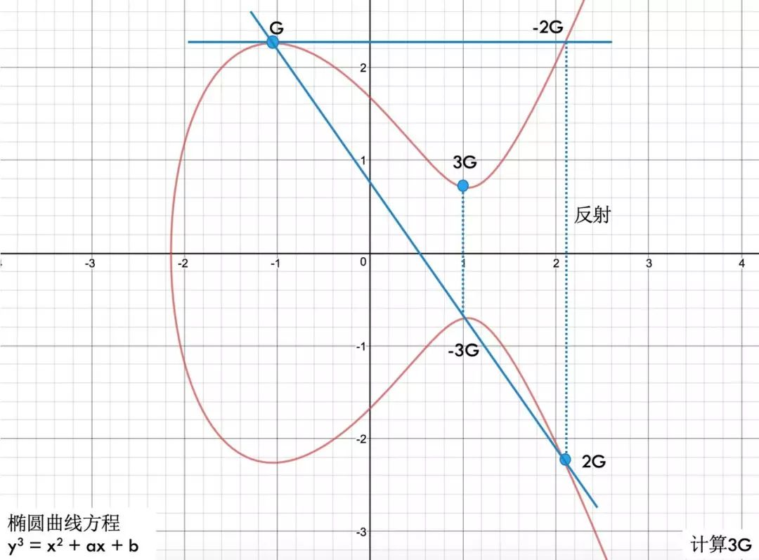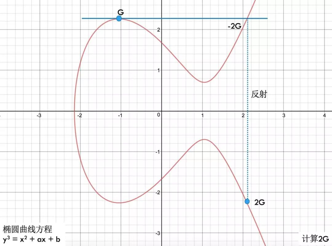 给定一个起点 G(x,y),现在要计算点 P=2G 的坐标,其过程是在 G 点上做一条线与曲线相切于 -2G,做 -2G 相对于 x 轴的反射便得到 2G 点。