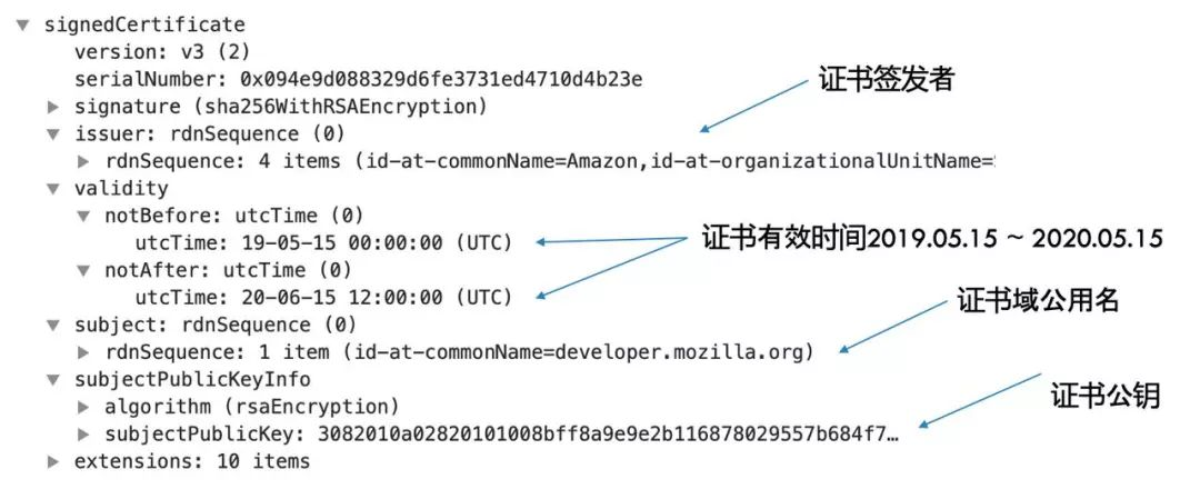 第二个证书是第一个证书的签发机构(CA)的证书,它是 Amazon,也就是说 Amazon 会用它的私钥给 developer.mozilla.org 进行签名。
