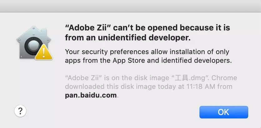签名验证算法和上文讨论的 TLS 证书一致。为什么可执行文件需要签名呢,因为如果不签名的话,系统会拦截安装或者运行,如 Mac 双击一个未签名的 dmg 包的提示: