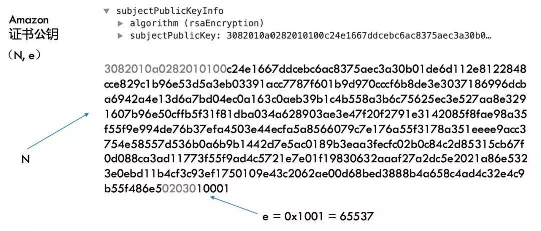 Amazon 的证书也具备上述结构,我们可以把 Amazon 证书的公钥拷出来,如下图所示: